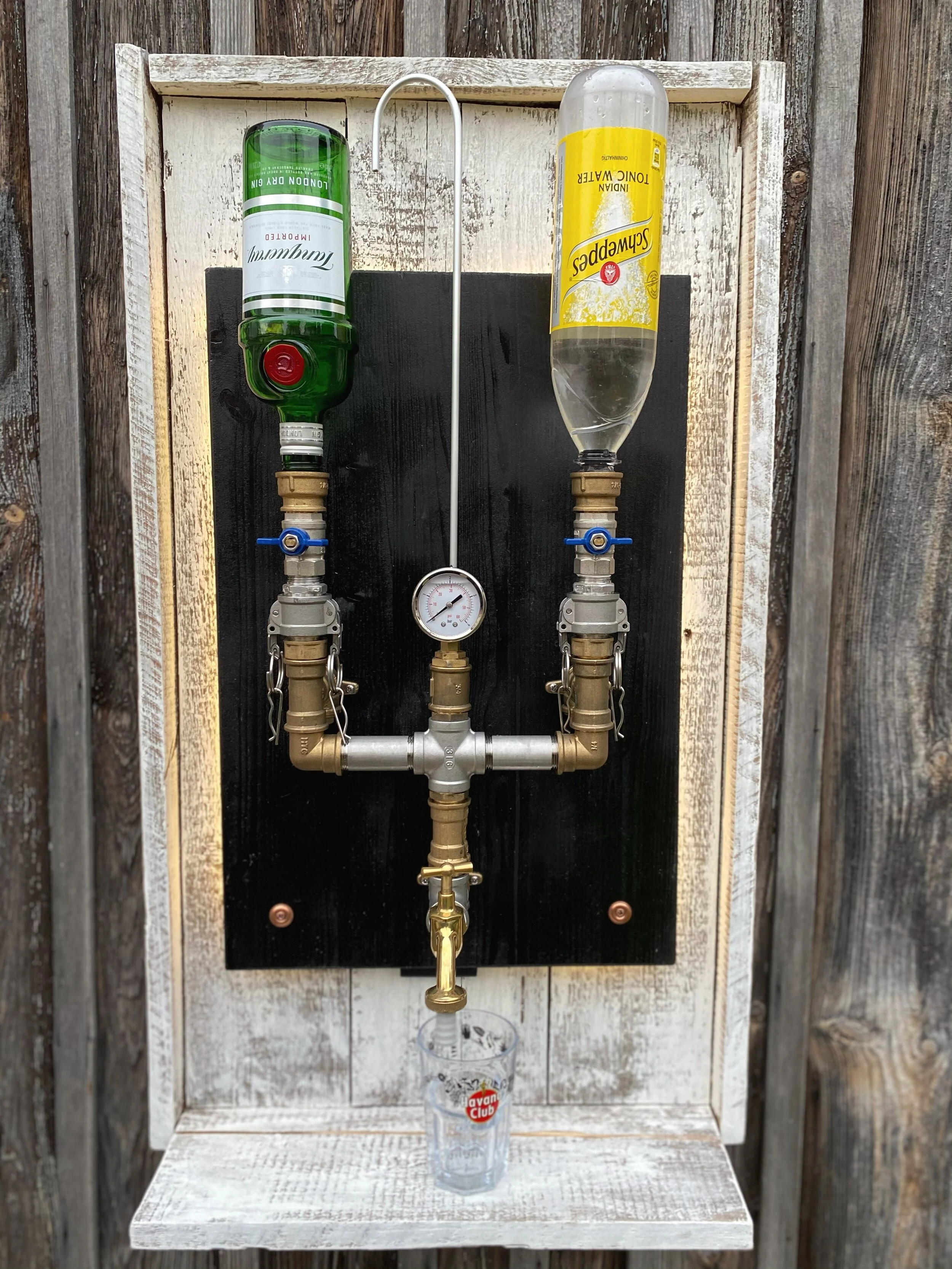 Über einen Kugelhahn an den Rohren aus Messing und Edelstahl kannst du deine Mischungen individuell dosieren. Die Spirituosenflaschen sind fest in der Halterung verankert. Der Bar Butler ist auf einem Holzrahmen im Shabby Look befestigt und kann so problemlos an der Wand befestigt werden. Im Holzrahmen ist eine indirekte Beleuchtung integriert.